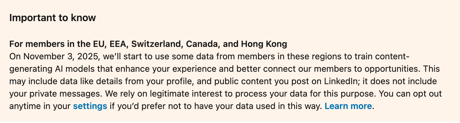 Funny enough, just last weekend I was reviewing my LinkedIn settings (for no particular reason - I’ve been less active there lately and more on other platforms). To my surprise, I came across those options and immediately turned them off, wondering how I had missed this before. A few days later, I started seeing posts from others pointing out that LinkedIn was indeed updating its Terms and data use to reflect these changes.