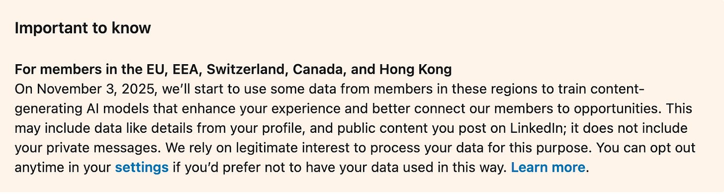 It’s not exactly surprising - many platforms have already done it - but now LinkedIn will also start using your data to train Microsoft’s AI. By default, consent is turned on, and you have until November 3rd to switch it off if you don’t agree.
